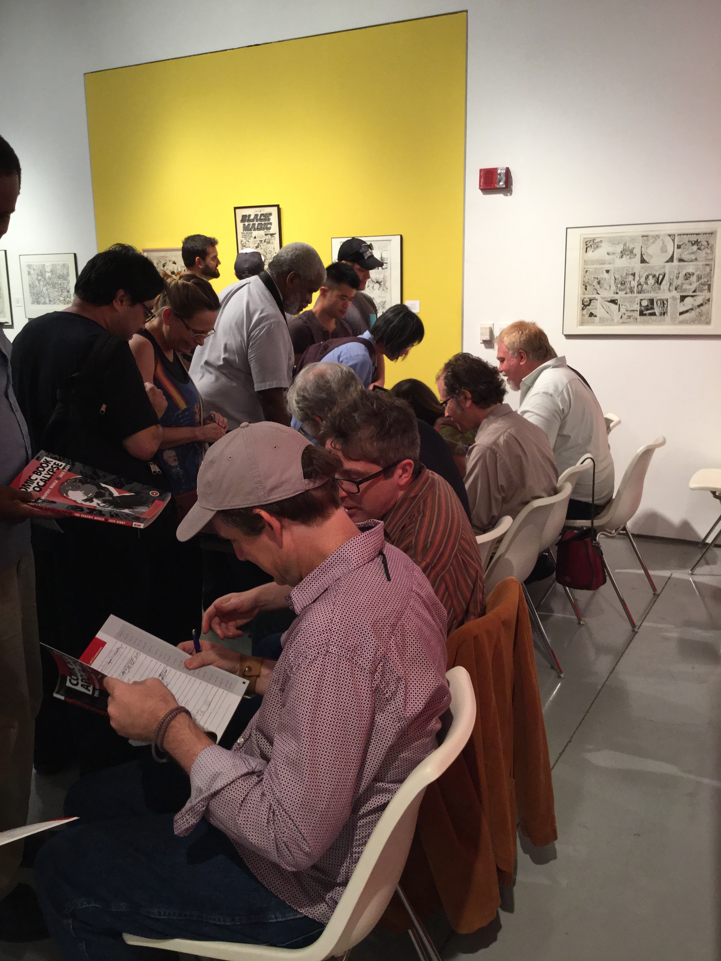 Many of us joined together to create an impromptu signing line in the Gallery—and so it was that our long-expected exhibition catalog, a beautiful tome co-published by IDW Publishing and the CSUN Art Galleries, finally made its public debut!