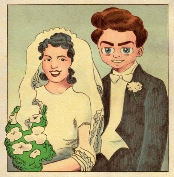 Of course, “accuracy” is not the only criterion that matters. Scioli’s Kirby does more than register the facts of Kirby’s life and the tales that Kirby told. It’s a comic, after all—a graphic performance—and it’s marked by some quirky artistic choices. Most obvious (even on the cover) is Scioli’s habit of drawing Jack with big, neotenic, manga-esque eyes. This habit starts about a fifth of the way into the book and becomes pronounced with his courtship of Roz and especially Kirby’s traumatic wartime period. Compare the above image of young Jakie clobbering a classmate (from page 12) with, for example, this image of Roz and Jack’s wedding (page 51):
