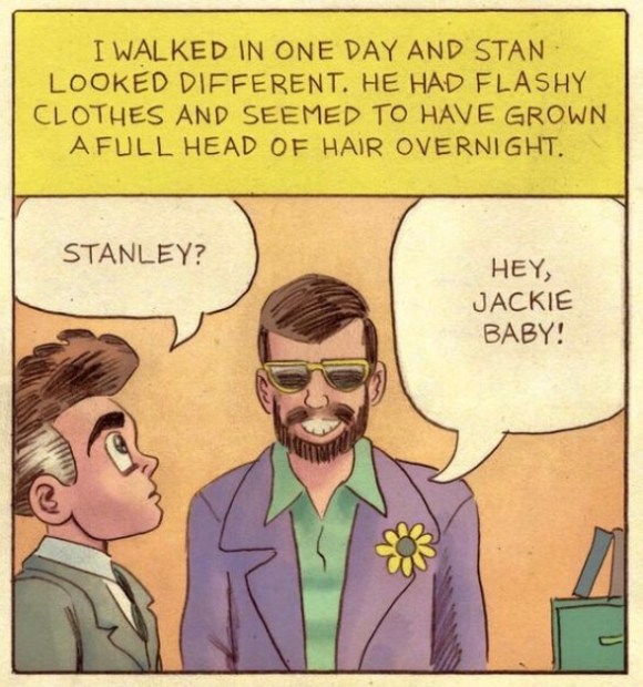Again, there are times when the book’s steady pulse yields big dividends: for example, Kirby’s first heart attack, in the Eighties, comes up suddenly, a red, wordless shock; the moment is powerful. Or: a pair of panels captures Jack and Roz’s deepening relationship and hints at the romance comics to come: