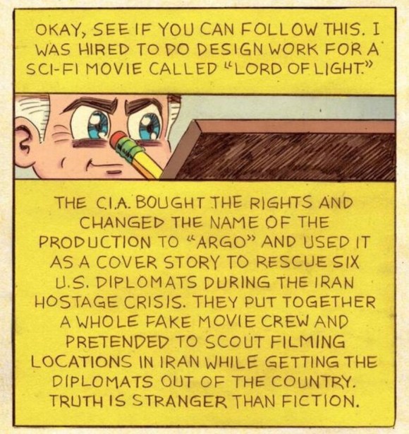 I wish Scioli had told less but unpacked and interpreted more. As the book marches through Kirby’s tangled career (briefly noting familial milestones en route), I get a sense of notes overwhelming story. Certain boxes are ticked off so quickly that I wonder why they were included at all. For example, the Lord of Light and Science Fiction Land project (1979), built around Kirby’s lavish conceptual drawings and famously used as a cover story by the CIA (see Argo), merits one crowded panel:
