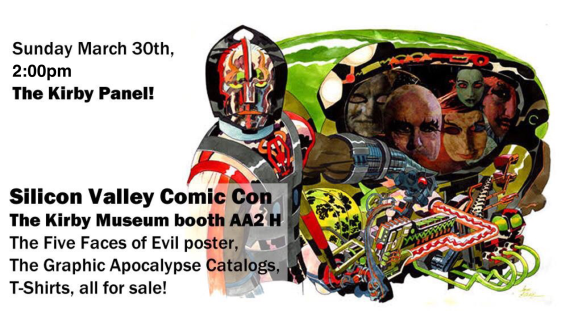 Signing and selling: Thanks to the Kirby Museum’s generosity, I get to spend some time signing and selling my Kirby studies books at the Museum’s booth. Copies of the Eisner-winning Hand of Fire (2011) and the Comic Book Apocalypse exhibition catalog (2015) will be available, and a cut of the proceeds will go to the Kirby Museum! Look for me on: