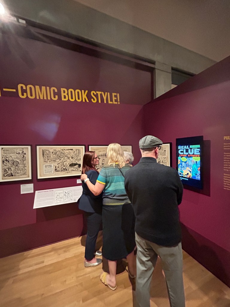 Today, May 1, the Skirball Cultural Center officially opens its career-spanning Jack Kirby exhibition, Heroes and Humanity (on view through March 1, 2026). Last night, the Skirball launched Heroes and Humanity (and its other brand-new exhibition, Away in the Catskills) with a reception and preview for members and supporters. This preview was well attended to the point of congestion: the museum’s courtyard was thronged, and jostling crowds packed the galleries. My wife and my daughter and I were there. So were a great many colleagues, friends, and acquaintances, some I hadn’t seen since the CSUN Kirby show almost ten years ago. In fact, the crowd was a Who’s Who of Kirby collectors and historians. Members of the Kirby family were there too (I spoke briefly to Kirby’s granddaughter Jillian, as well as, to my surprise, Joe Simon’s grandson Jesse). At the night’s end, the Skirball’s staff could hardly get the Kirby crowd out of the museum; as we drove away, the front steps were still teeming with people.