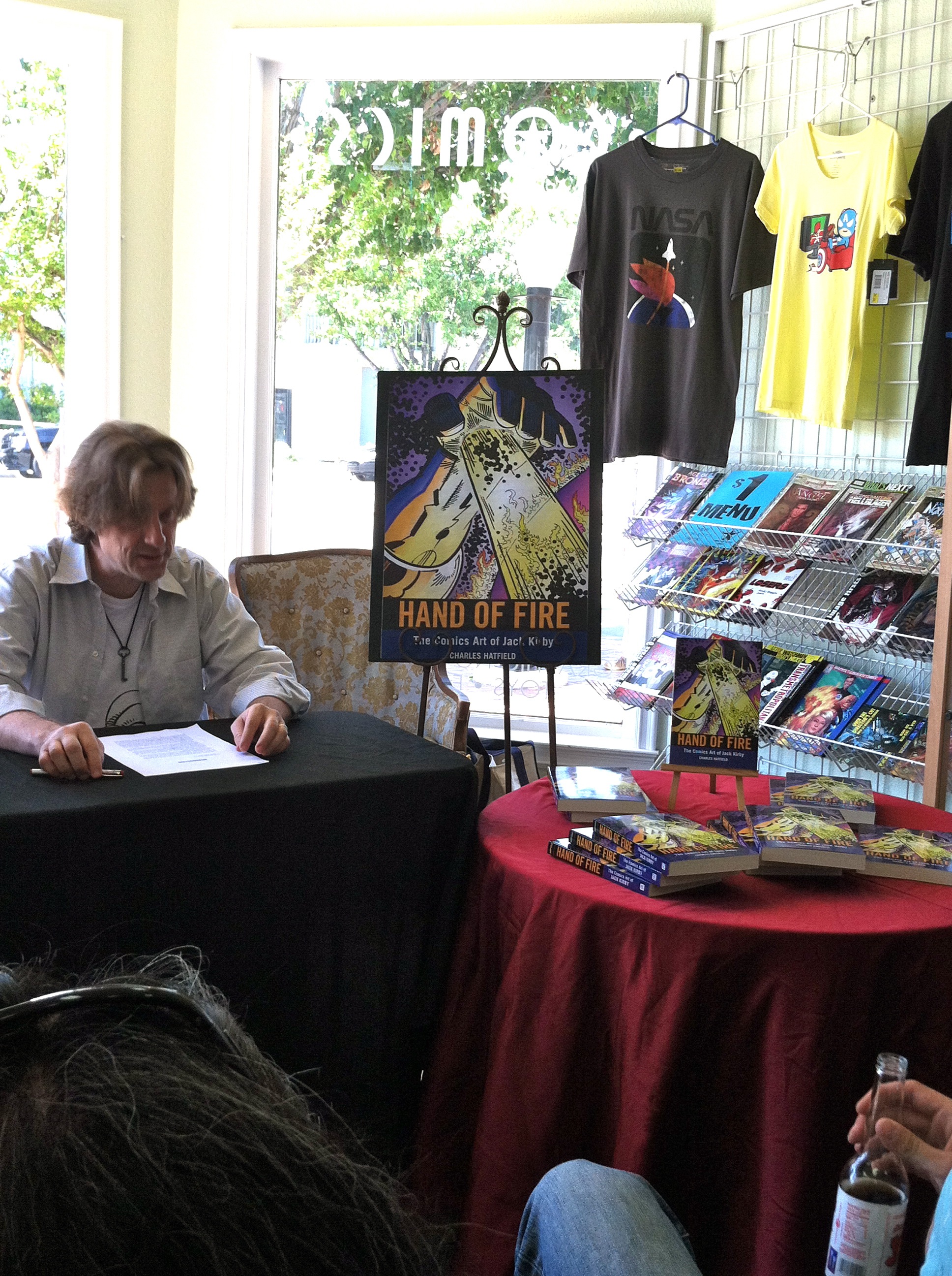 Wow—such enticements! But of course you don’t have to have come to any of the previous Saturdays to buy a signed copy of Hand of Fire on May 26th. Fear not—just walk right in and look for the man with the halo of Kirby krackle and the fiery red pen!