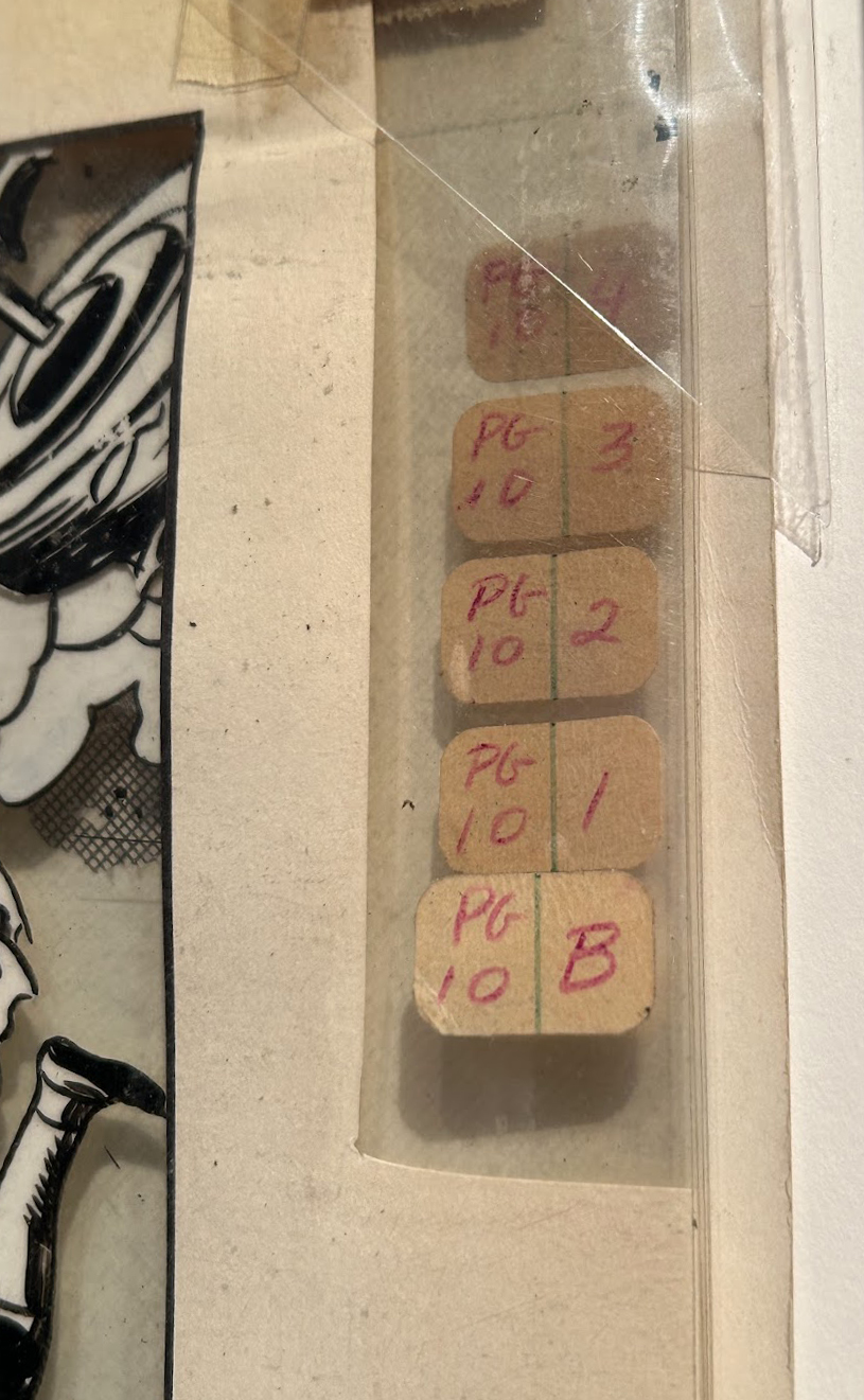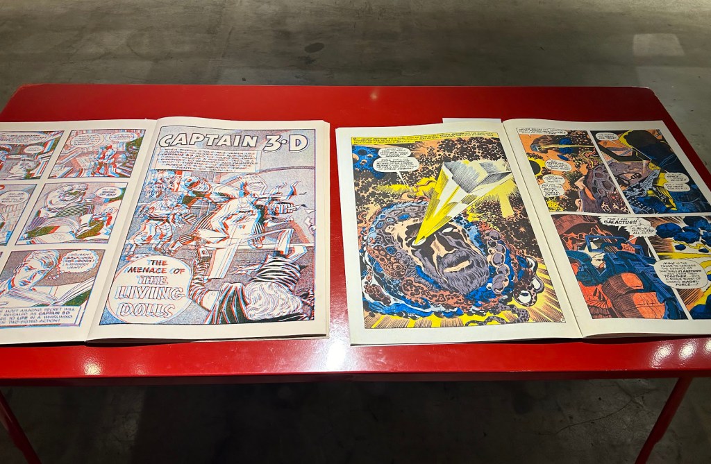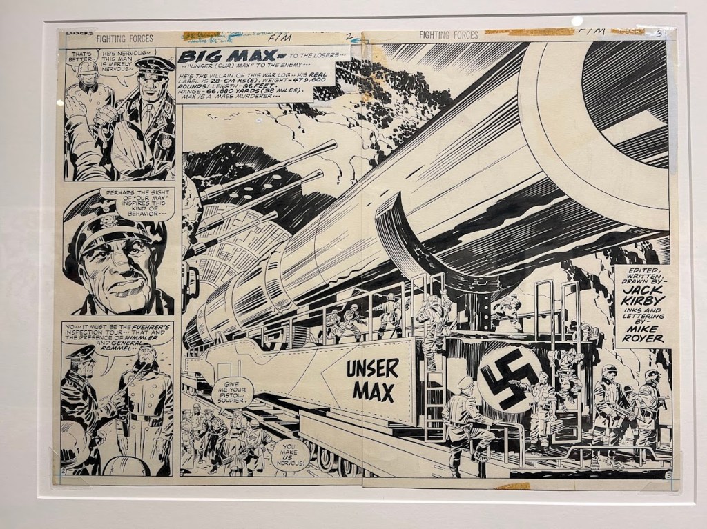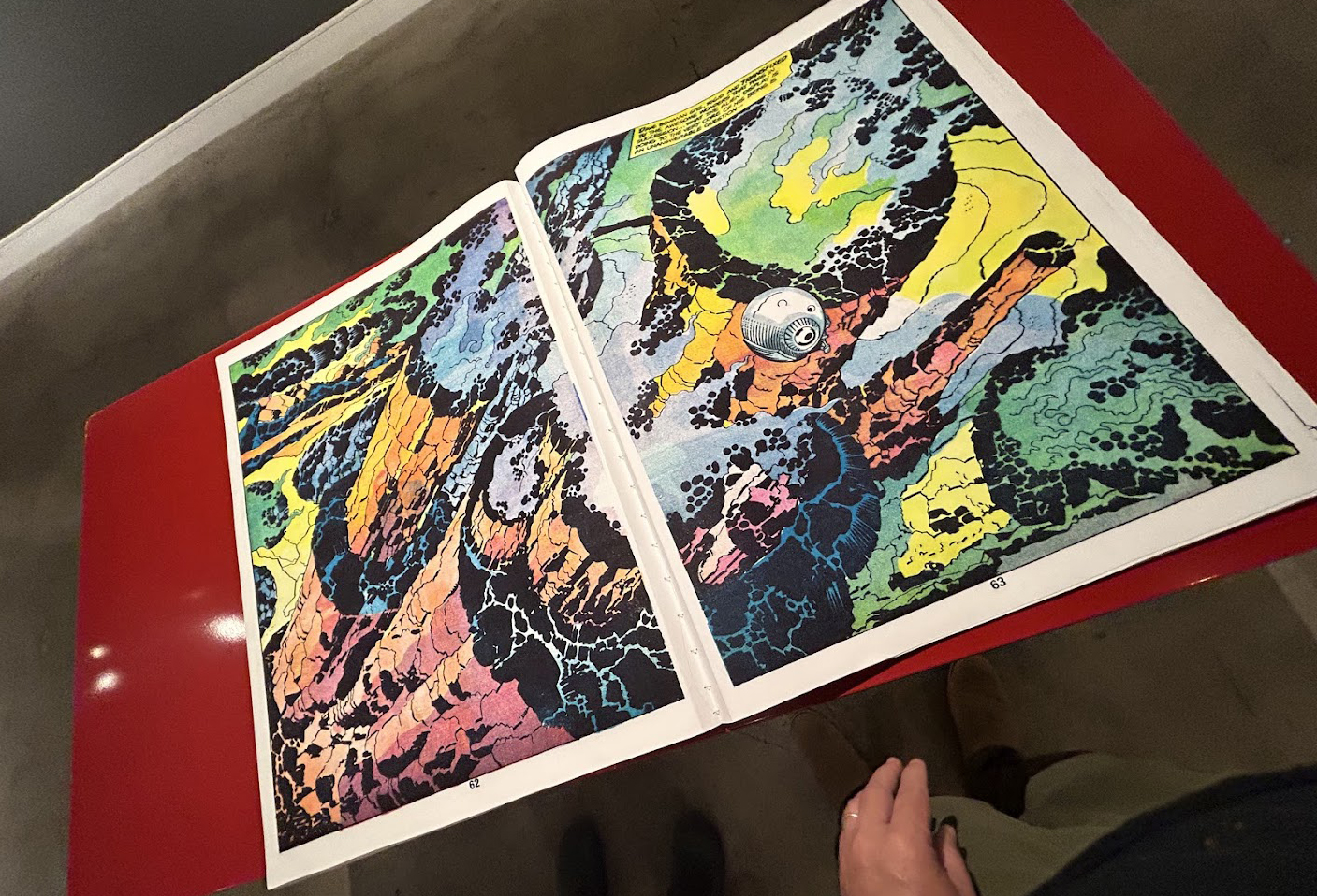 Another highlight of the side gallery is the presence, on four tables, of oversized facsimiles of Kirby comic books, complete with advertising and editorial matter as originally published. Tom Kraft, Kirby Museum President and design wizard, has been producing facsimiles like these since Kirby’s centennial in 2017. Scanning old comics at ultra-high resolution, he and his colleagues then print and bind them as enormous, durable books that visitors are welcome to flip through and read at leisure. These giant books cross the gap between comic art designed for reading and the more spectacular, scaled-up experience we typically expect in museums and galleries. They make it possible to see Kirby’s work up close as if you were a small child just learning to handle physical comics (their scale is both delightful and daunting!). On this occasion, the Museum has provided 17 by 22-inch recreations of Captain 3-D #1, Young Romance #8, Fantastic Four #48, New Gods #7, and Our Fighting Forces #152. I like this mix of famous and more obscure works. In addition, and this is the pièce de resistance, there’s a gigantic, 22 by 30-inch version of Kirby’s adaptation of Kubrick’s 2001: A Space Odyssey. This gets a table unto itself, which is good, because I spent a long time admiring its bombastic pages—some of which Kirby himself colored, in saturated, psychedelic mode. I’ve always liked the idea of exhibiting comic art in poster-sized yet readable form (an unfulfilled dream of mine for Comic Book Apocalypse), as it brings immediacy and accessibility to the gallery experience, and it’s great to see the Kirby Museum pulling this off.
