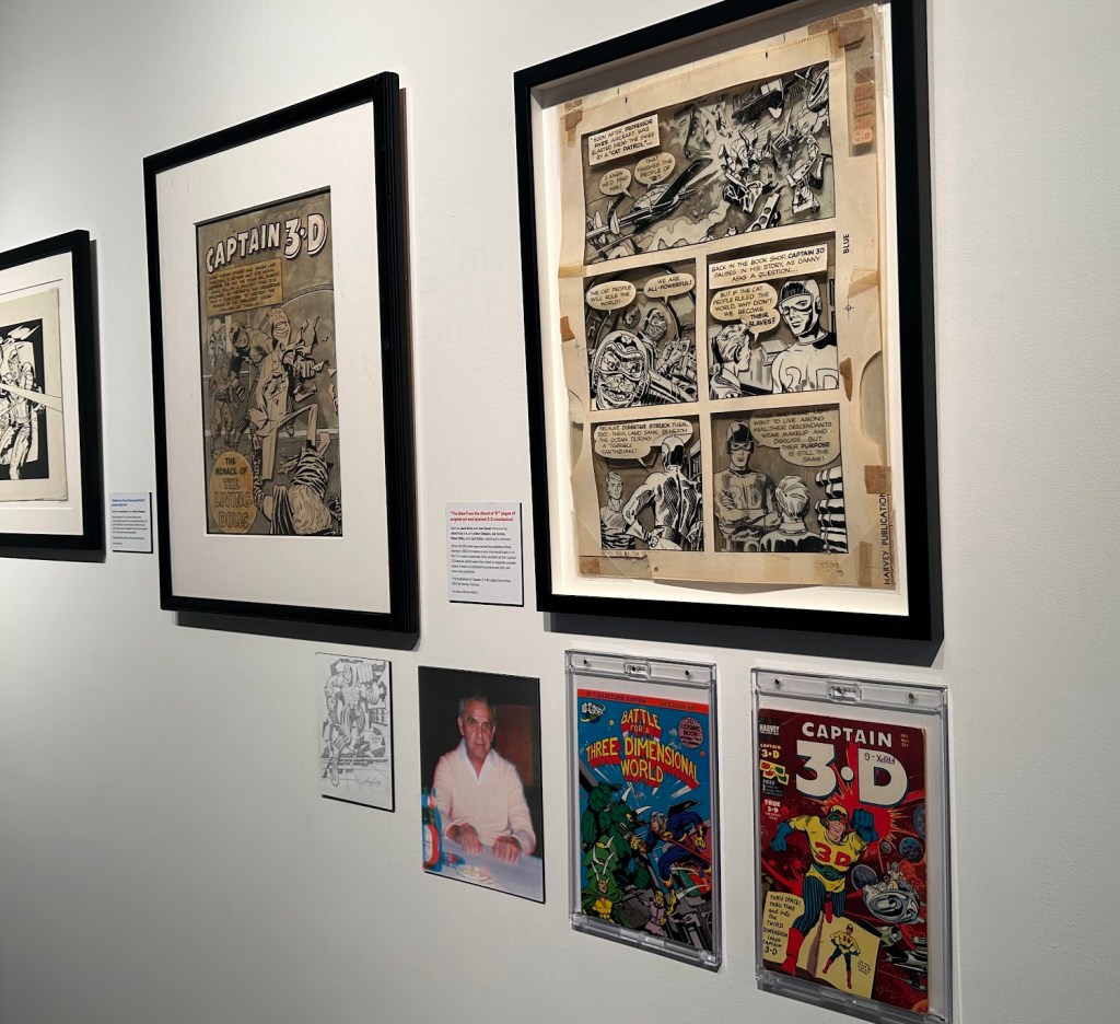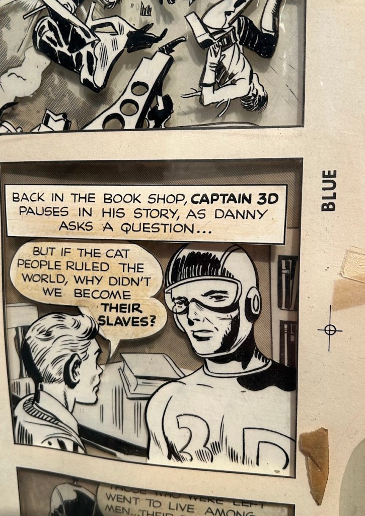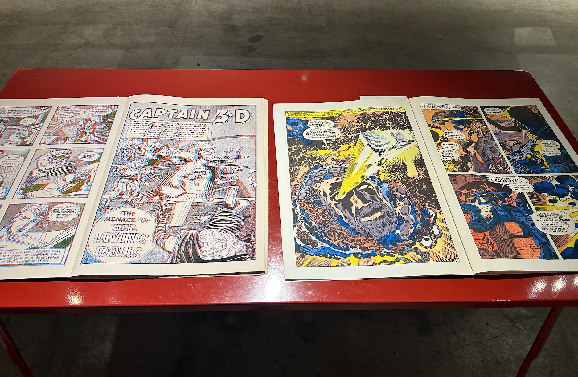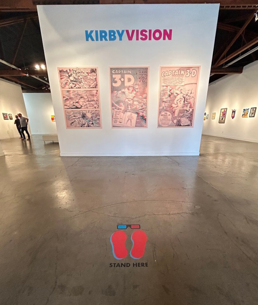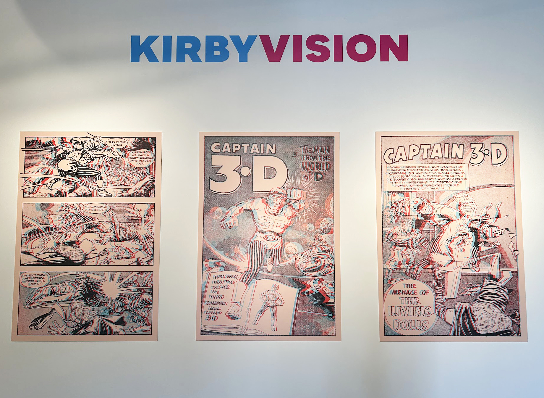 In effect, the 3-D hook gives Kirbyvision a brand identity (while suiting the Helford’s retro Pop sympathies). Displayed near the gallery entrance are two originals from Captain 3-D itself that hint at the laborious processes used to make 3D comics in the early Fifties. Those originals consist of Kirby-drawn elements separated ontolayers of acetate, as well as shaded backgrounds on what appears to be Craftint paper. The originals are well preserved, yet their aged patina contrasts with the gorgeous wall-sized reproductions. This is both instructive and cool. Also displayed here are the published Captain 3-D and Kirby’s later 3D collaboration with Ray Zone,Battle for a Three Dimensional World (1982). Further in, attentive visitors will find an oversized reproduction of the entire Captain 3-D comic book (again, hold on to your glasses!).