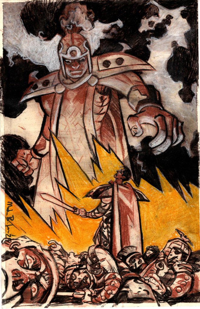 The selection on unpublished, personal work by Kirby knocked me right out. Beautiful, widescreen collages, the stunning drawing of Jacob wrestling the angel (scripture as SF, or vice versa), an explosively colored drawing of warfare: eye-boggling, revelatory work. I got to see a few pieces I’ve never seen before, even in reproduction.