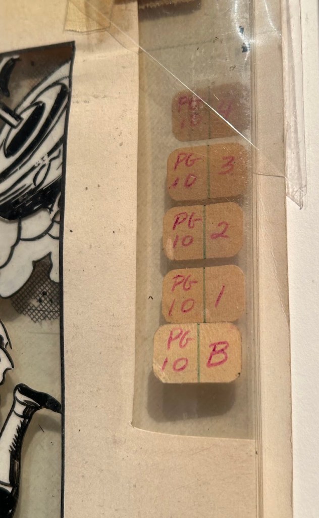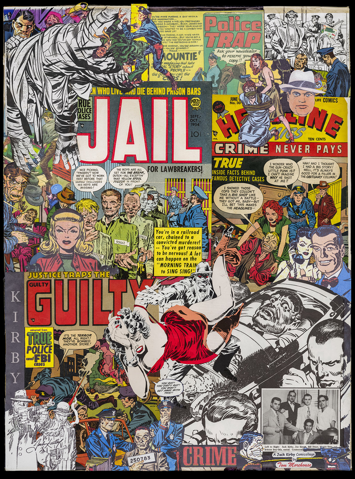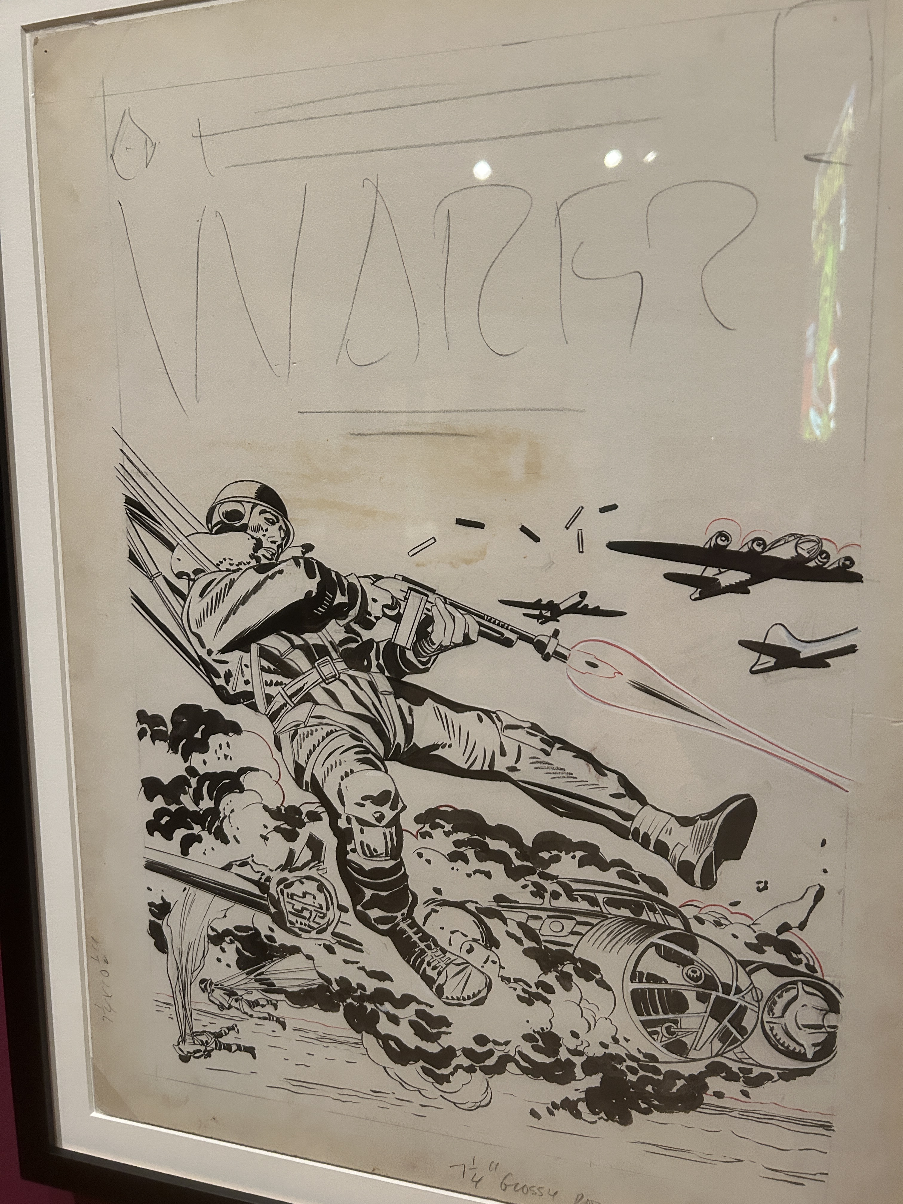 The originals, nearly fifty, are juxtaposed with reproductions of penciling process and, at the same time, images showing Kirby’s influence on screen adaptations (including the Marvel Cinematic Universe). Putting Kirby’s autographic work next to reminders of these adaptations feels like a deliberate strategy. One long wall represents well-known Marvel IP, including Captain America, The Fantastic Four, Thor, The Hulk, The X-Men, and The Avengers, while facing walls and tables lean into Kirby’s personal style and themes. The range of work shown, from 1940s to the 1980s, and from drawings to collages, suggests the arc of Kirby’s career. The genres sampled are many (and sometimes blurred), from superheroes, science fiction, and myth fantasy, to romance, crime, horror, and war. Many facets of Kirby are on display: his futurism, but then again his primitivism; his rapturous psychedelia, but then again his hard-hitting, lived-in urbanism. Various eras and collaborators are represented (among the inkers, I counted at least Dick Ayers, D. Bruce Berry, Vince Colletta, Frank Giacoia, Mike Royer, Joe Sinnott, Chic Stone, Mike Thibodeaux, and Kirby himself). Most importantly, this exhibit suggests something of Kirby’s outlook and spirit.