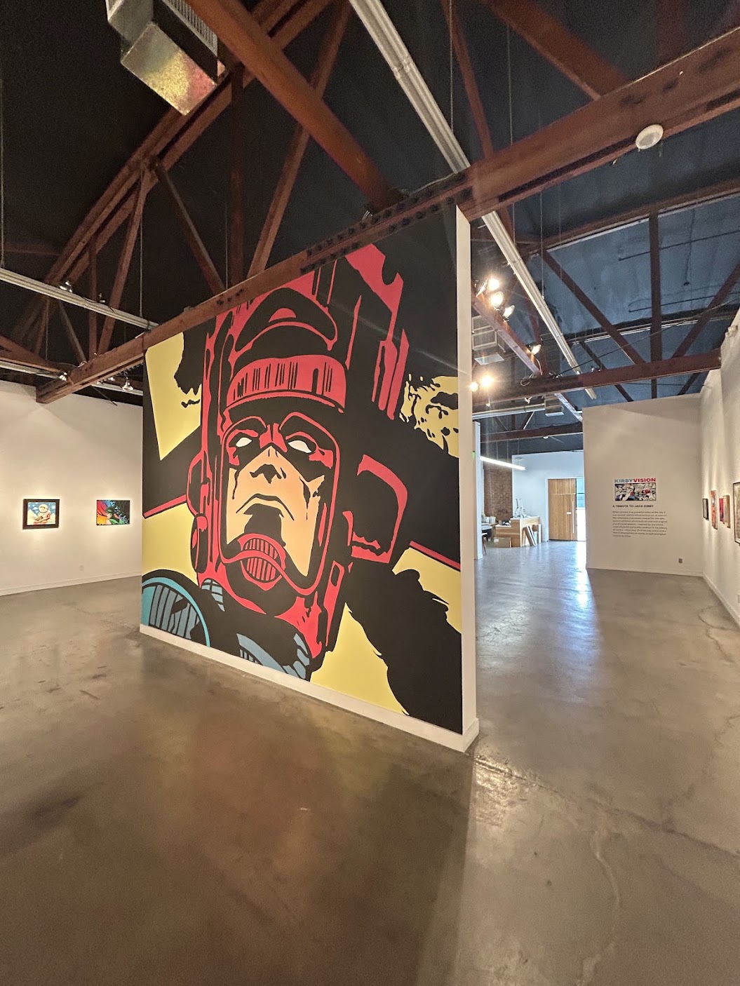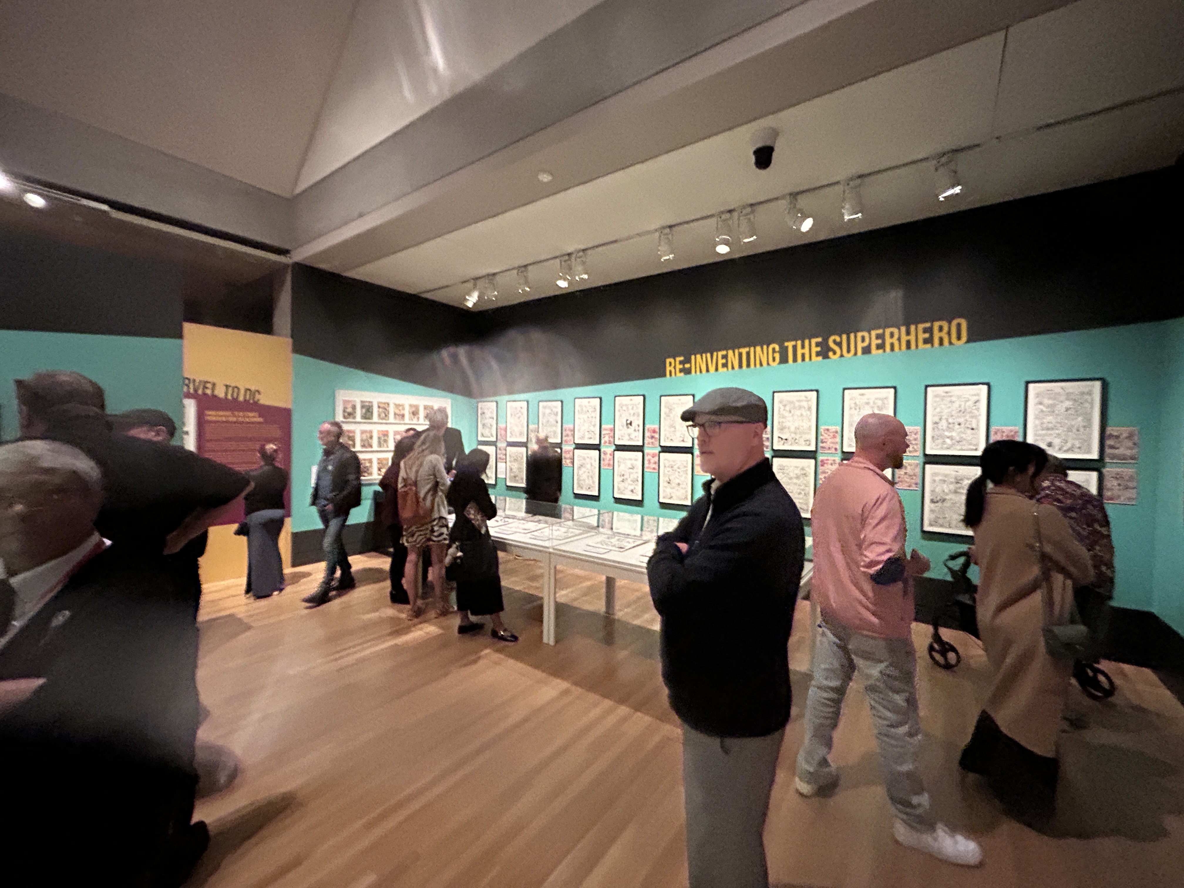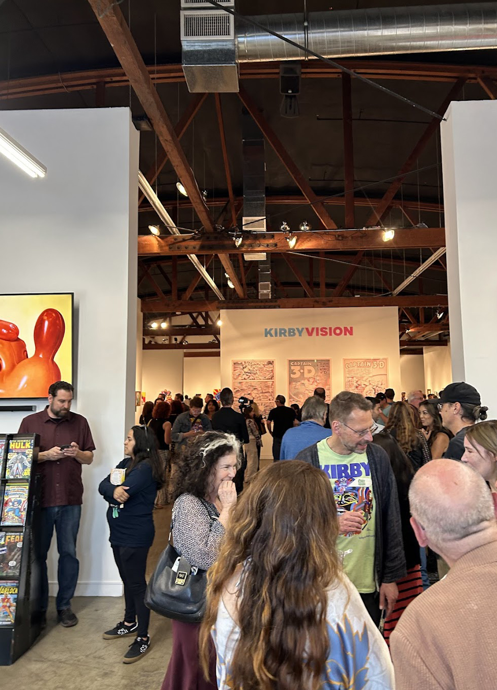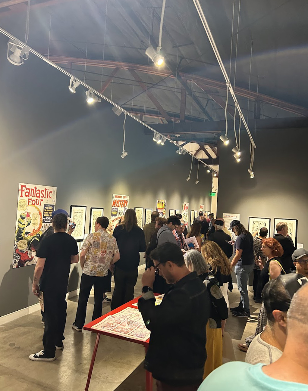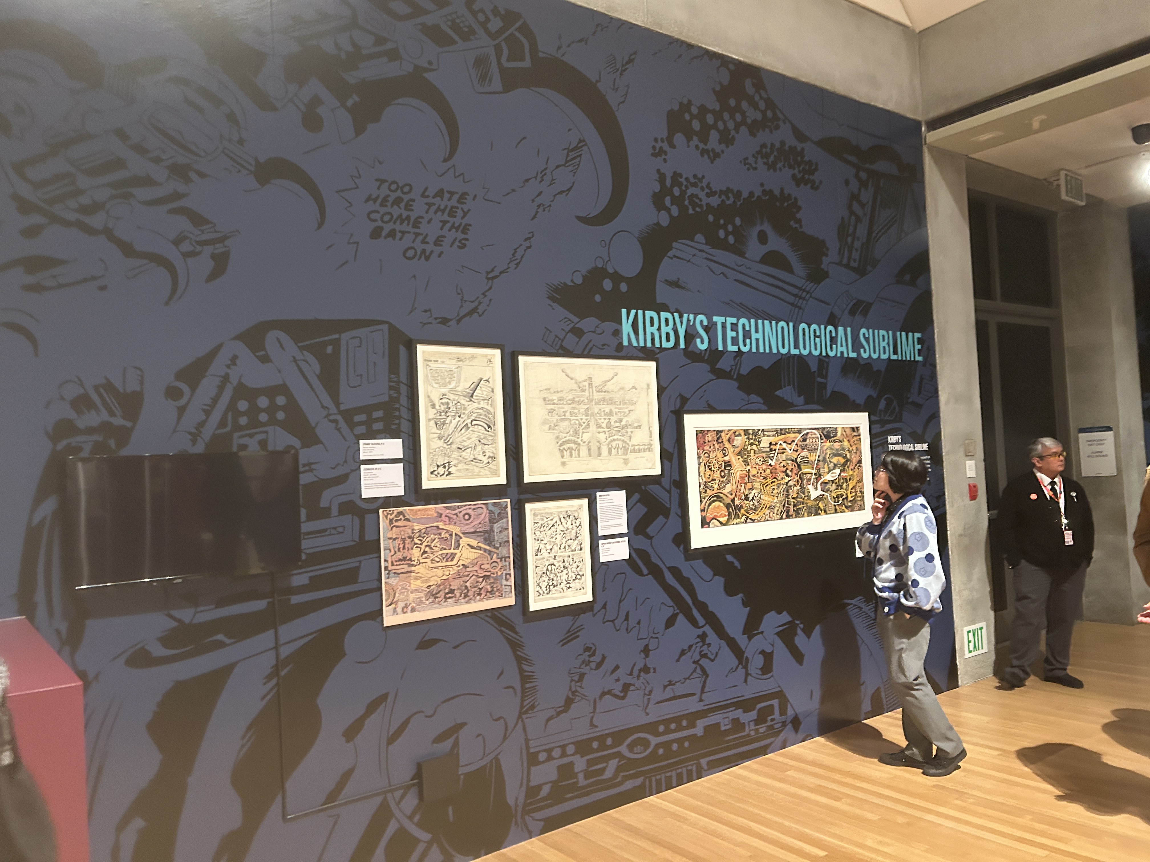 Today, May 1, the Skirball Cultural Center officially opens its career-spanning Jack Kirby exhibition, Heroes and Humanity (on view through March 1, 2026). Last night, the Skirball launched Heroes and Humanity (and its other brand-new exhibition, Away in the Catskills) with a reception and preview for members and supporters. This preview was well attended to the point of congestion: the museum’s courtyard was thronged, and jostling crowds packed the galleries. My wife and my daughter and I were there. So were a great many colleagues, friends, and acquaintances, some I hadn’t seen since the CSUN Kirby show almost ten years ago. In fact, the crowd was a Who’s Who of Kirby collectors and historians. Members of the Kirby family were there too (I spoke briefly to Kirby’s granddaughter Jillian, as well as, to my surprise, Joe Simon’s grandson Jesse). At the night’s end, the Skirball’s staff could hardly get the Kirby crowd out of the museum; as we drove away, the front steps were still teeming with people.