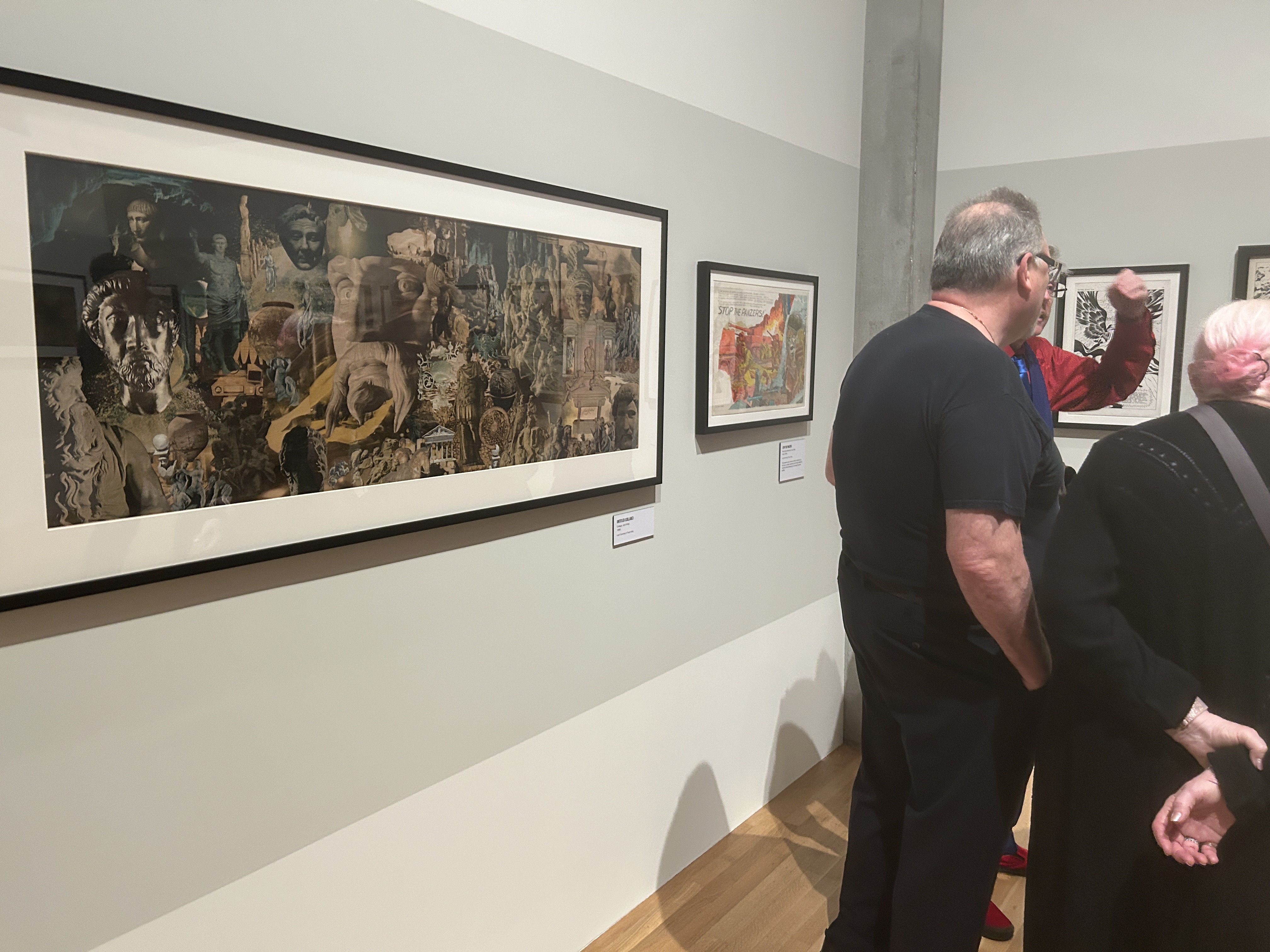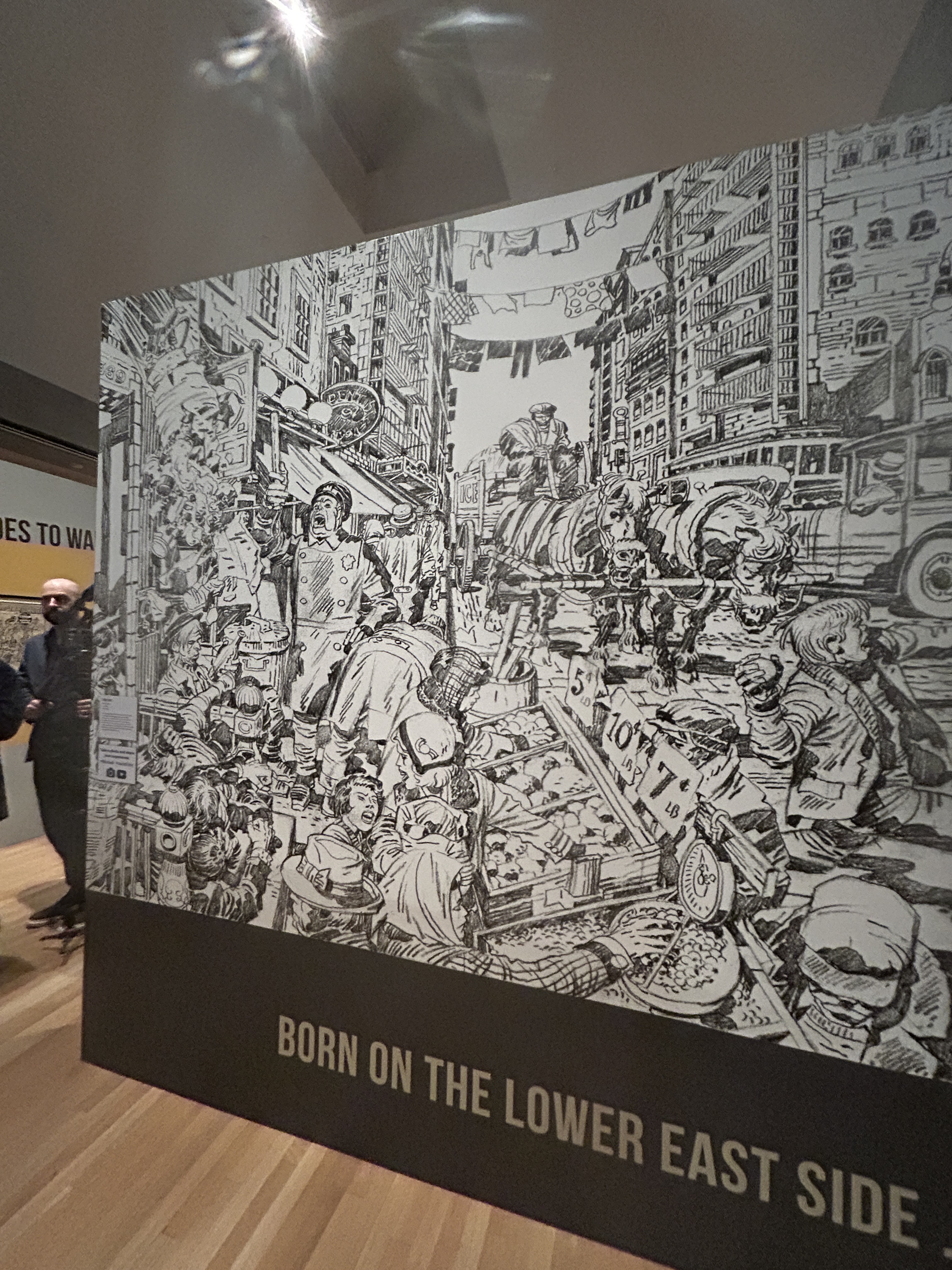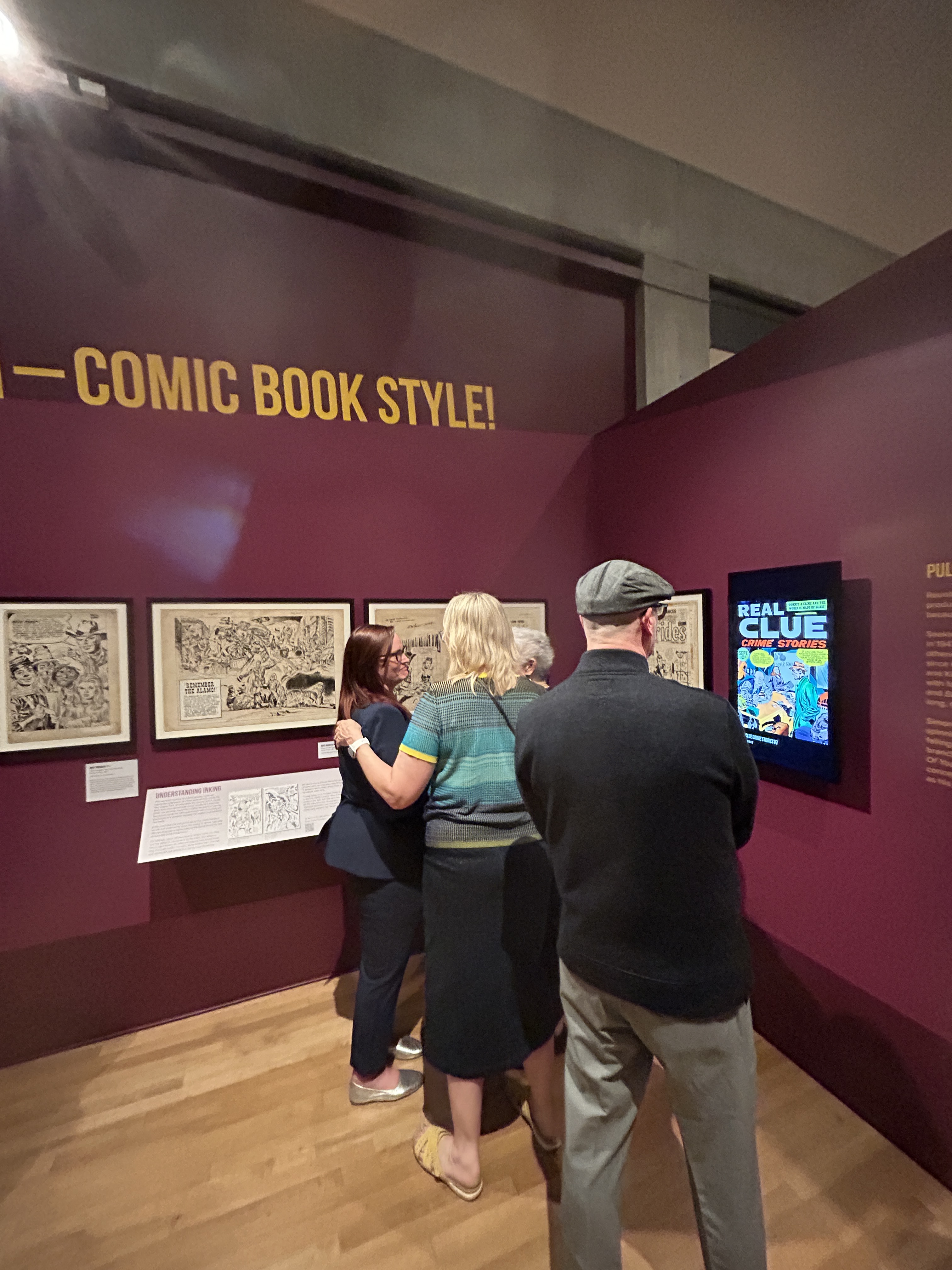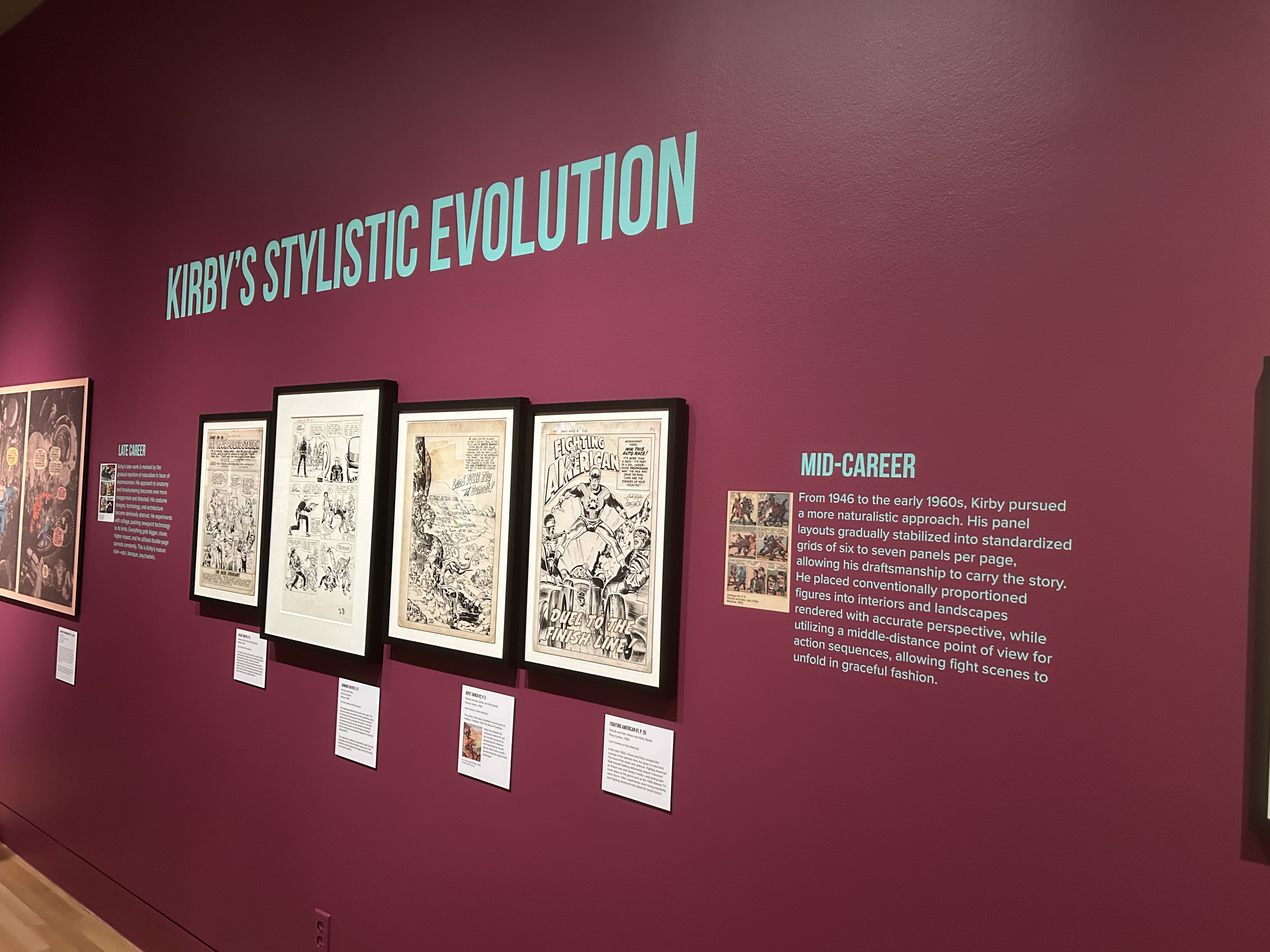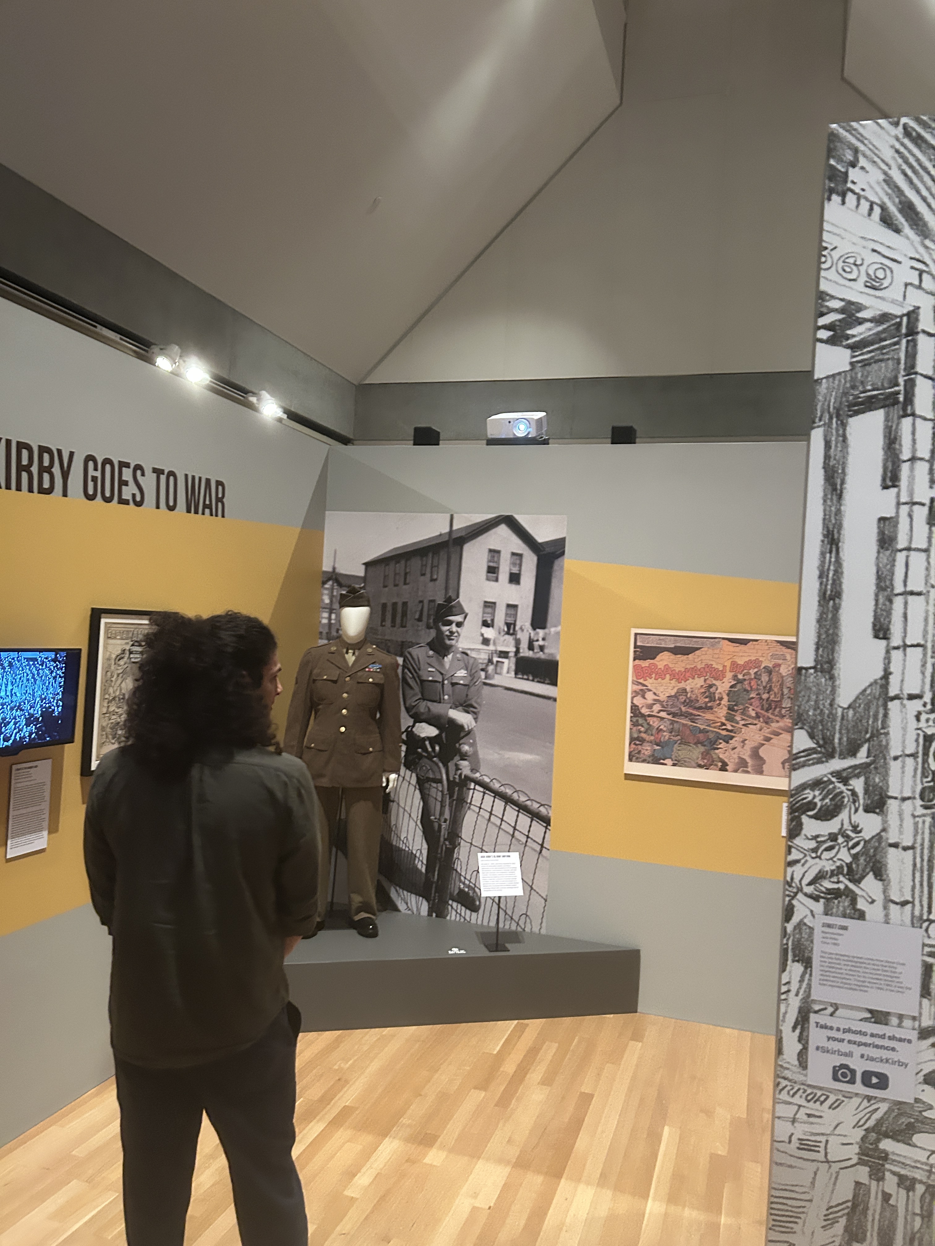 Today, May 1, the Skirball Cultural Center officially opens its career-spanning Jack Kirby exhibition, Heroes and Humanity (on view through March 1, 2026). Last night, the Skirball launched Heroes and Humanity (and its other brand-new exhibition, Away in the Catskills) with a reception and preview for members and supporters. This preview was well attended to the point of congestion: the museum’s courtyard was thronged, and jostling crowds packed the galleries. My wife and my daughter and I were there. So were a great many colleagues, friends, and acquaintances, some I hadn’t seen since the CSUN Kirby show almost ten years ago. In fact, the crowd was a Who’s Who of Kirby collectors and historians. Members of the Kirby family were there too (I spoke briefly to Kirby’s granddaughter Jillian, as well as, to my surprise, Joe Simon’s grandson Jesse). At the night’s end, the Skirball’s staff could hardly get the Kirby crowd out of the museum; as we drove away, the front steps were still teeming with people.