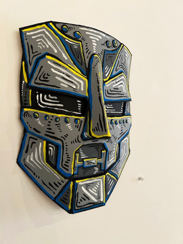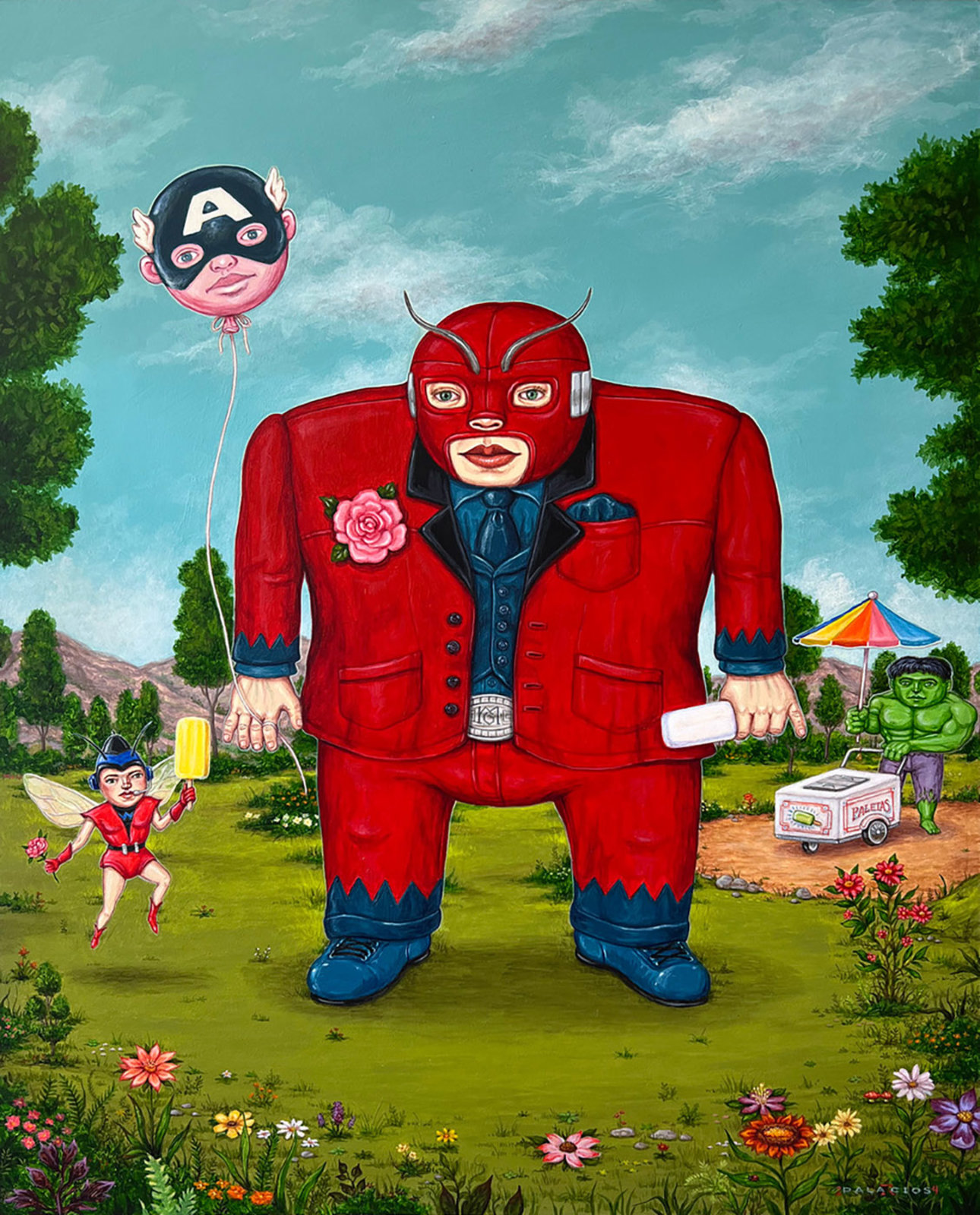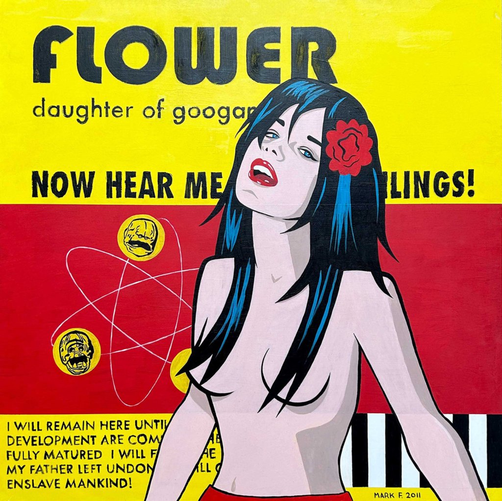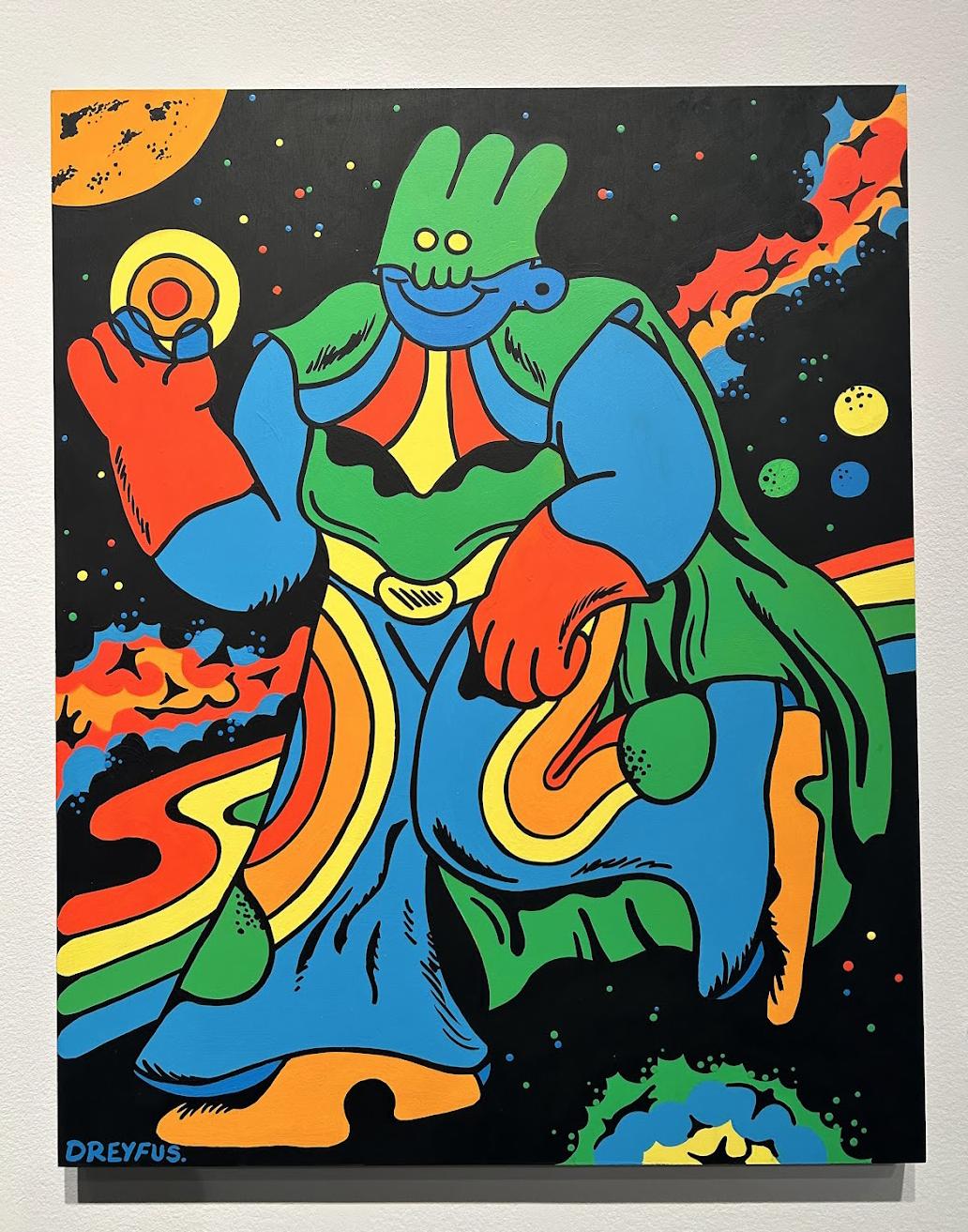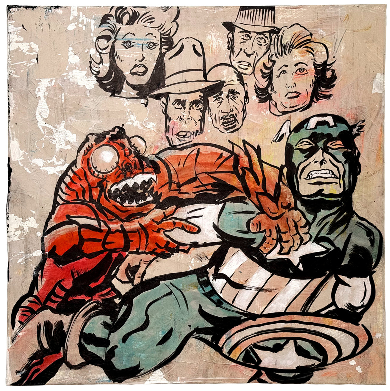 Many of my favorite pieces here depart from the Kirbyesque, or do Kirby style in odd, left-field ways that I find refreshing. These would include the life-size Dr. Doom Mask (acrylic on sculpted cardboard) by artist Nonamey; the canvas Five Cents, by Shaky Kane, which turns Kirby’s Captain America into an outsize bubblegum card; and Mark Frauenfelder’s Flower, Daughter of Googam, which bizarrely combines Flower, Kamandi’s near-nude wild-child love interest, with references to an early-1960s Marvel monster.