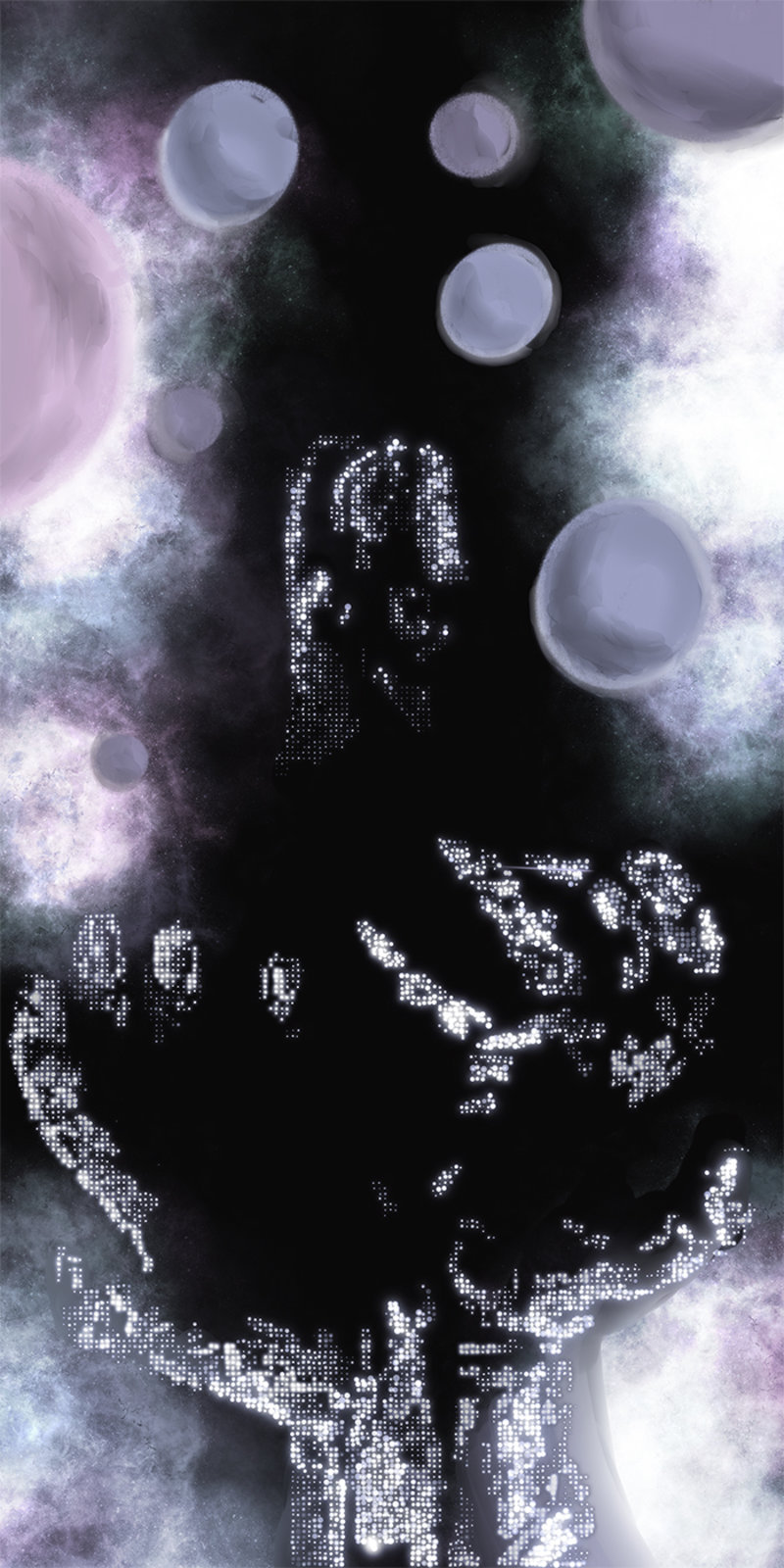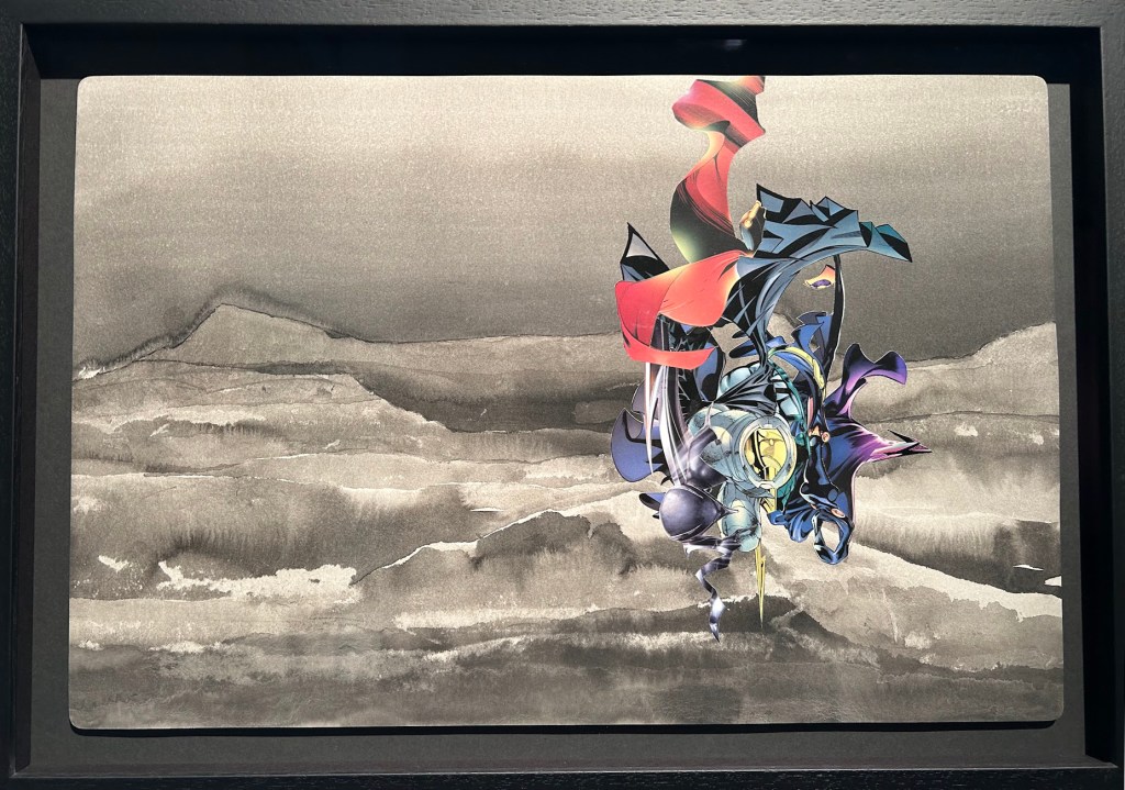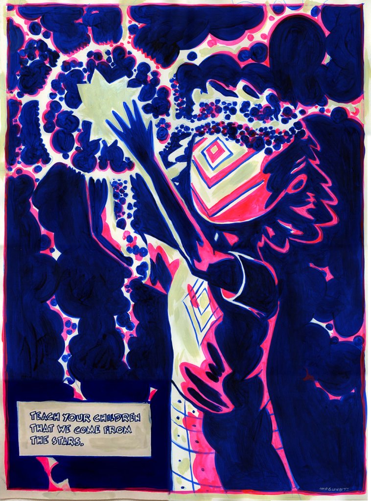 For me, one of the coolest spots in the show juxtaposes Mark Badger’s lively drawing Julius Caesar’s Ghost Appears to Brutus (a spinoff from his Kirby-inspired Caesar comics project?) and Sydney Heifler’s enigmatic digital print Rising, a dark, obscure image in which points of light (like glowing pegs on a pegboard) form a figure rising from two cupped hands, in a seeming homage to the Silver Surfer rising from the hands of Galactus. These are very different works, but their one-two punch delighted me (dig the big hands!). I’d say look out for odd moments of connection or contrast like this throughout.