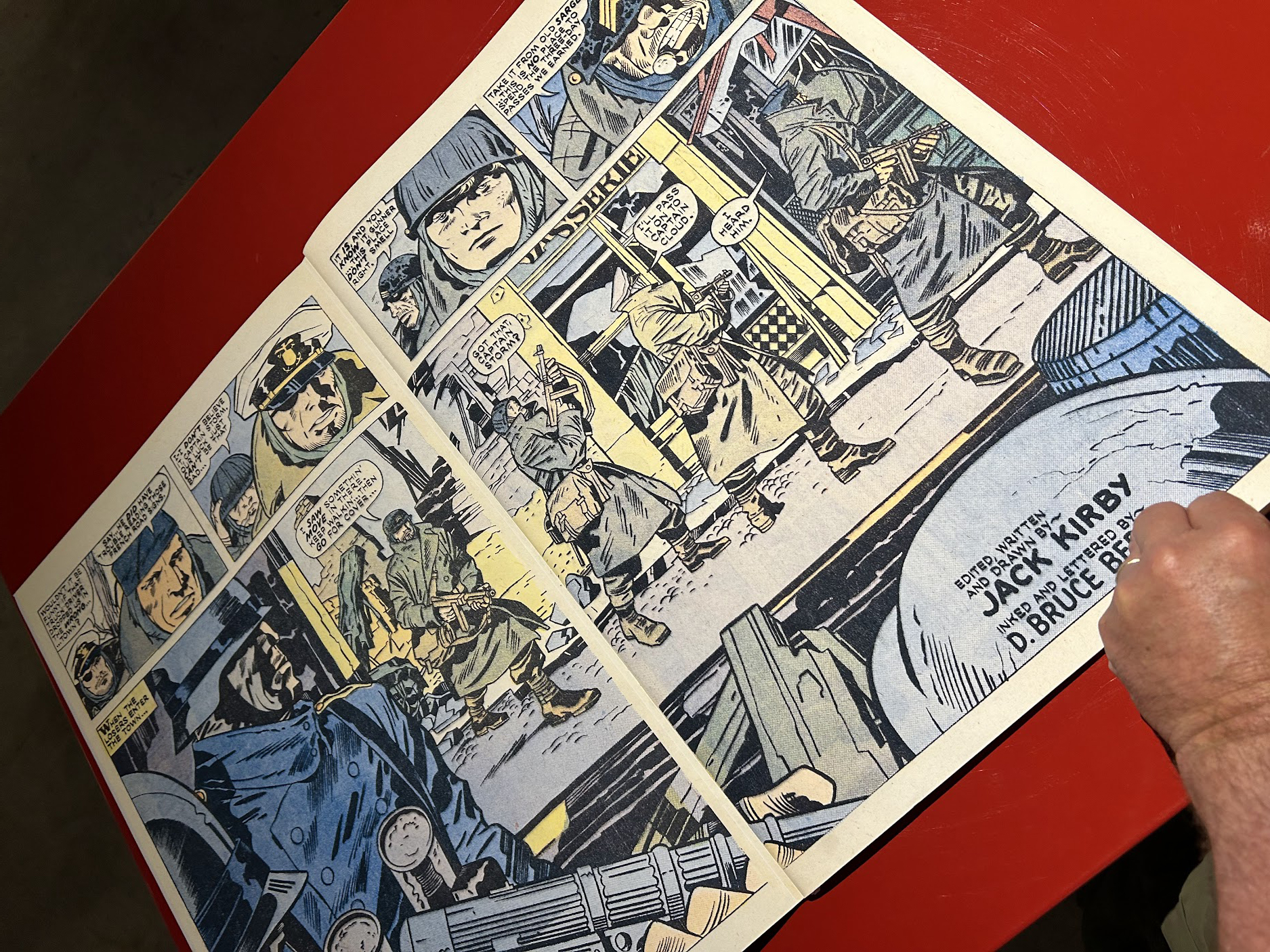 My introductory comics studies course at CSU Northridge, Comics & Graphic Novels (a bad name, and I’m to blame for it), is focusing on Kirby this semester. That’s a focus my classes haven’t had since 2015. Why again now? Mainly because of the Skirball’s splendid exhibition, Jack Kirby: Heroes and Humanity, which I’ve written about here before and which my students are required to visit. That exhibit, curated by Patrick Reed and Ben Saunders, is open until March 1 next year, and I’m determined to take classes to it. When you’ve got that kind of resource in town, that big and historic a show, not using would be a terrible waste. So, we’re going there, and that means I’ve had to redesign my course yet again! Glad to do it.