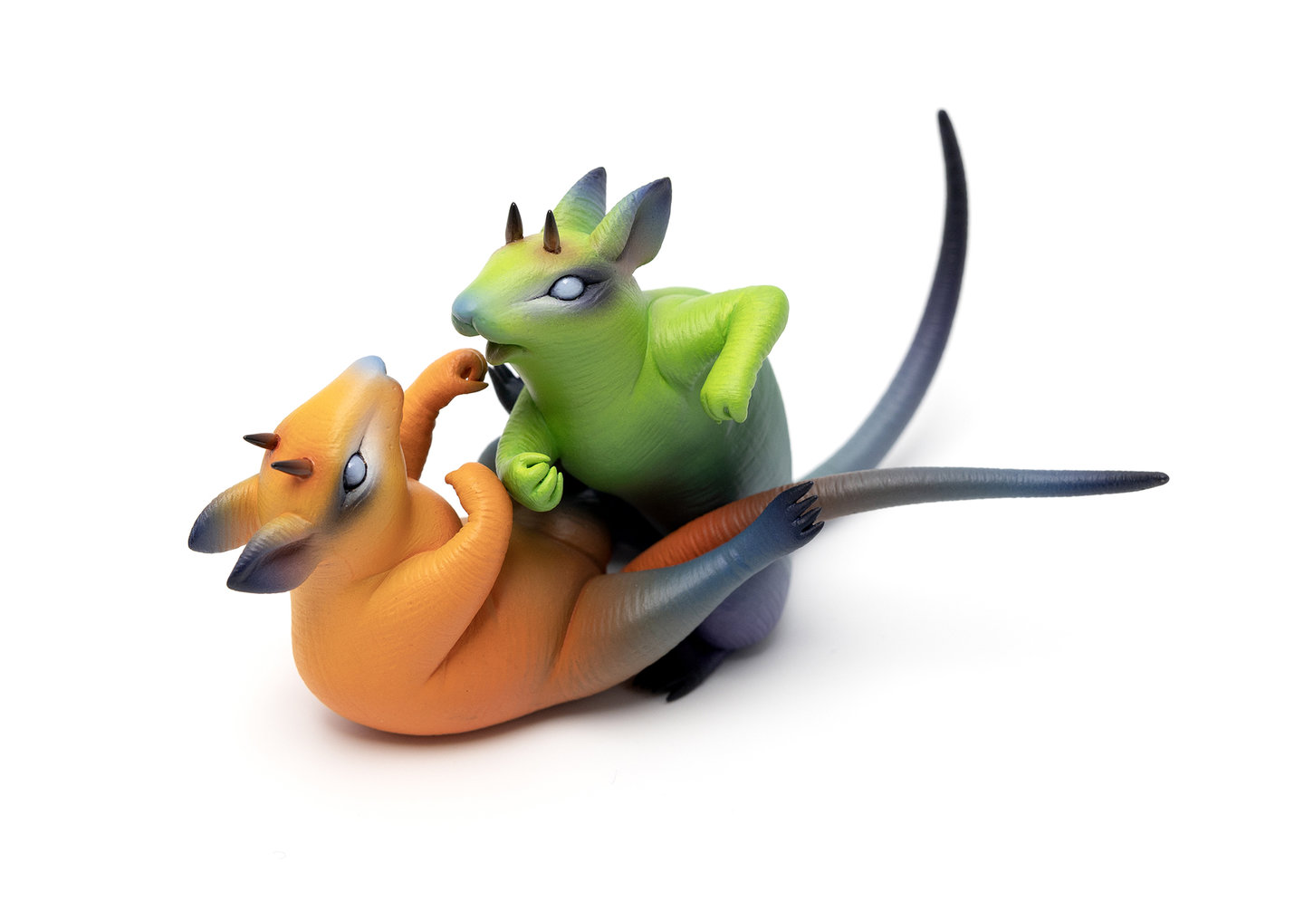 Most of Kirbyvision is presented in traditional white-cube style, with works on the walls proceeding clockwise. Some of the works are homages or détournements of recognizable images by Kirby, such as Patrick McDonnell’s Captain America canvas, The Last Superhero, or Tom Morehouse‘s collage, Kirby Crime, which mashes up images culled from decades of Kirby’s work in crime comics. On the other hand, some works are looser evocations of theme or genre that do not strive to be graphically Kirbyesque, such as Erika Sanada’s miniature ceramic Versus, with its two cute, rabbit-like critters locked in combat, or Aaron Noble’s collage The New Man, which blends swirling, cape-like elements, culled from various drawings of superhero costumes, into a hovering, abstracted shape. Some works cleave to a stylized naturalism familiar from mainstream comic books, while some are more explosively graphic, like Charles Glaubitz’s crackling acrylic and gouache drawing Teach Your Children That We Come from The Stars. Some are sober, but others playful, like Ashley Dreyfus’ Atomic Man, a groovy, bell-bottomed hero, or Robert Palacios’ Giant Man’s Day Off, a charming portrait of the Marvel icon as luchador (this and several other pieces reminded me of artists like Mark Ryden or Ivana Flores who traffic in subversive neotenic cuteness, a common enough approach nowadays). Overall, techniques on view range from rubbery cartooning to airbrushed polish, from precisely rendered surfaces (again, Slater) to frenetic painterly smudging.