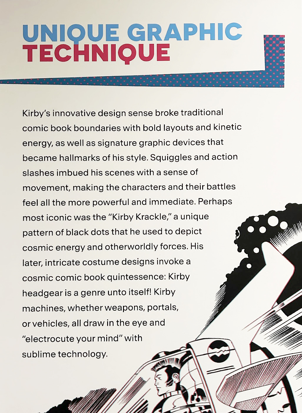 Besides paying tribute to Kirby, Kirbyvision contextualizes Kirby himself via a side gallery of Kirby originals organized by the Kirby Museum (the art on view in this side gallery, note, is not for sale). This is a smaller space, but dense with art and information. It feels distinctly museum-like, in the sense of didactic, yet also welcoming and visually sumptuous, building on the Museum’s track record of accessible pop-up exhibitions. Wall-mounted blurbs, succinct and informative, guide visitors through Kirby’s career thematically rather than chronologically. Newcomers to Kirby can learn a lot here about his graphic style, storytelling habits, range of genres, and famed titles and characters. The emphasis is on Kirby’s handiwork and the outpouring of his sensibility, not on corporate-owned IP (though there is plenty about that too).